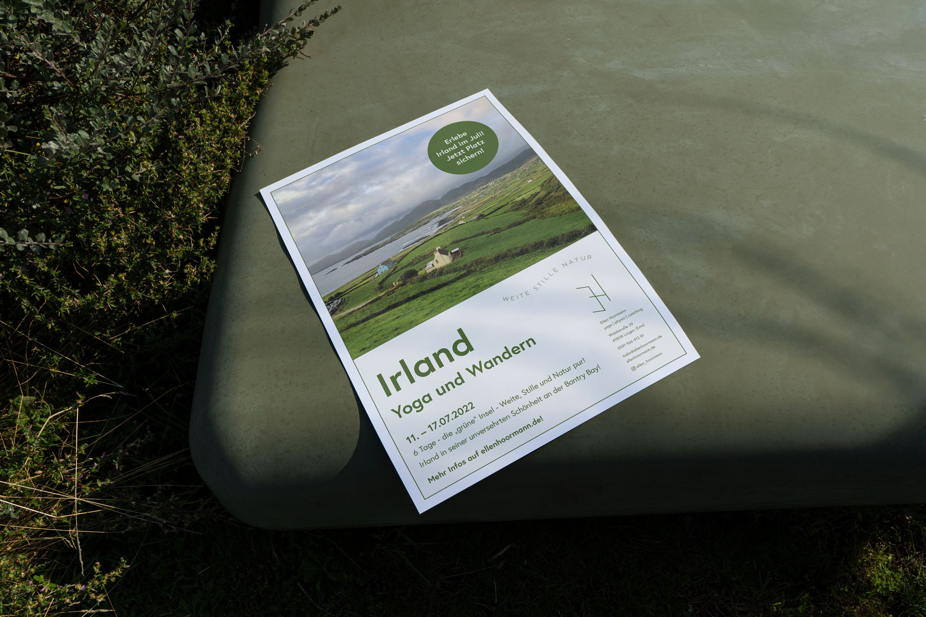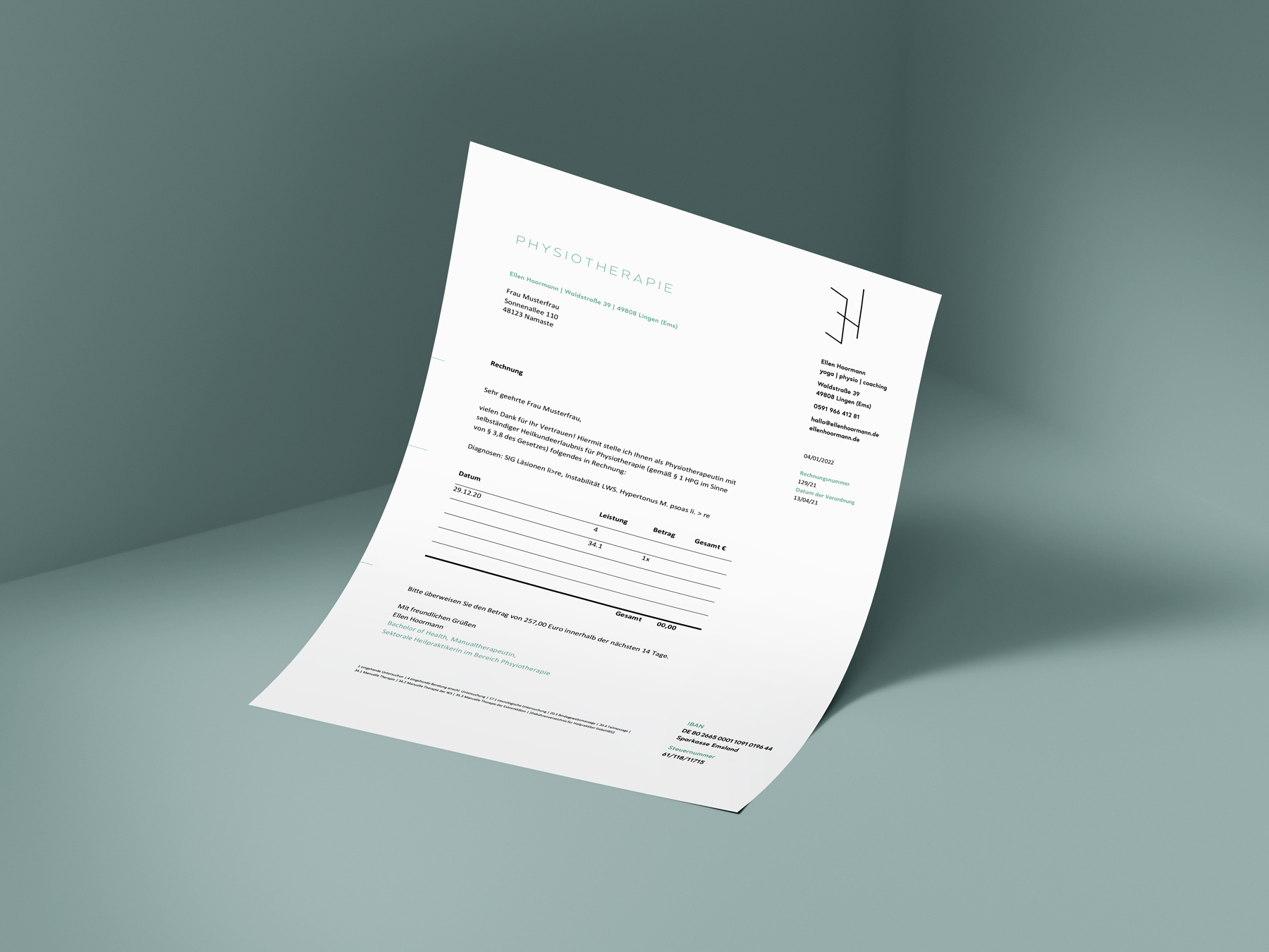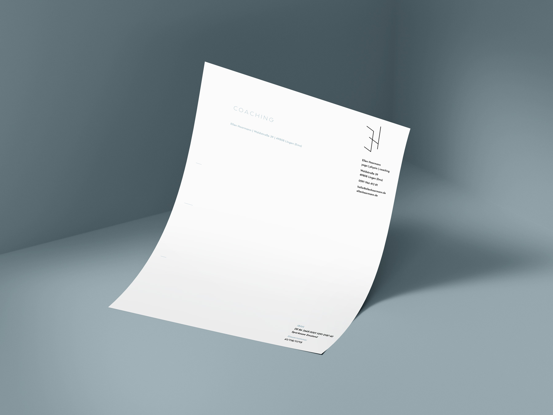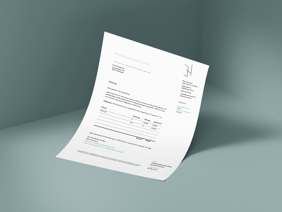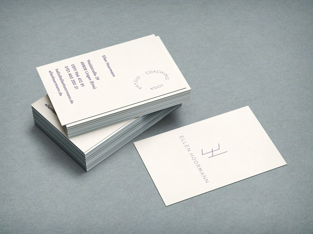 Corporate design for Ellen Hoormann. Her studio/practice is in Lingen (Ems) and she offers a variety of yoga classes as well as physiotherapy and coaching. Her wish was to have a design that reflects all three areas.